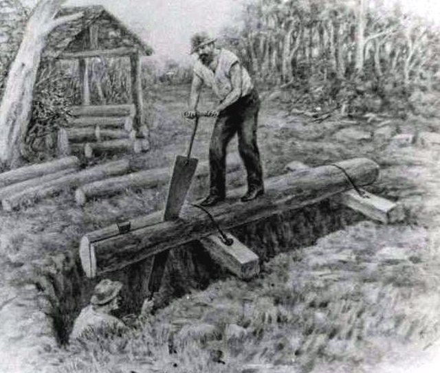 This one I am not so sure of. So if you have any info, please feel free to share it with me. Some etymologies say it comes simply from the weaker dog in a fight, back in the days of dog-fighting. But I prefer this one which I saw recently on Twitter, and which also stirred a distant memory of my own pre-internet researches. The underdog was the name for the guy at the bottom of the saw pit, in the days when they sawed logs by hand with a long steel tree saw (see below). The “underdog” had the worst job of the two, because he would have to endure being covered with sawdust all day long. It came to mean an unlucky person. And from there to its modern meaning of the one most likely to lose a contest. I hope in the old days, the underdog was able to swap positions with the “overdog” from time to time.