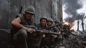 The Williamite regular forces looked on them as no better than bandits, thieves and murderers, men who wore no uniform and who stole and killed indiscriminately. Orders were given that they were to be put down like vermin. John Childs, the pre-eminent British historian of the period, writes in The Williamite Wars in Ireland: “In the movie Full Metal Jacket [still pictured above], the USMC helicopter skims across South Vietnam, its machine gunner fires indiscriminately at everyone in sight despite the fact that they are obviously civilians, drawling, ‘if they run they are VC, if they stand they are disciplined VC’. The attitude of William’s Protestant soldiers was identical: anyone in arms, or not demonstrably opposing the irregulars, was regarded as a raparee to be hunted down and killed.”