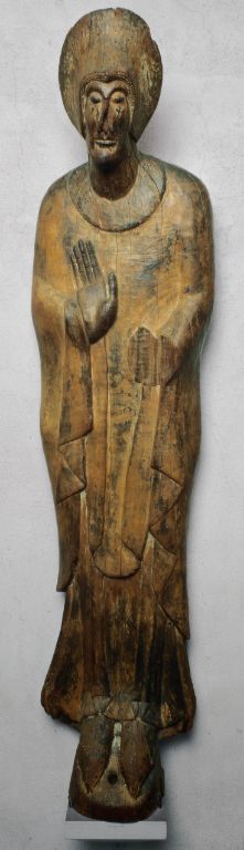 Let’s return to the beginning of the 20th century and the Valley of Boi in the high Pyrenees. At the same time that the marvellous painting of Christ in Majesty was discovered in St Clement of Taull, a set of wooden sculptures was discovered in another church dedicated to St Mary in the valley a few hundred yards away. These figures were part of a tableau, dated to about the same time as the fresco in St Clement’s church, which is most likely to depict the Descent from the Cross – statues of Mary and Joseph of Arimathea, and perhaps Nicodemus, helping to bring down Christ’s dead body after the Crucifixion. In other contemporary examples of this sort of tableau, Christ’s hand is seen as dangling over a wooden bowl held by his mother, in a manner such that a few drops of his blood might fall into the bowl. The wooden statue of Mary bears a striking resemblance to the image of the Virgin in the painting in St Clement’s. Both have the same clothing, the same posture, the same expression – indeed the resemblance is so striking that scholars believe that one must have been a copy of the other, although it is impossible to say whether the painting inspired the wooden statue or vice versa.